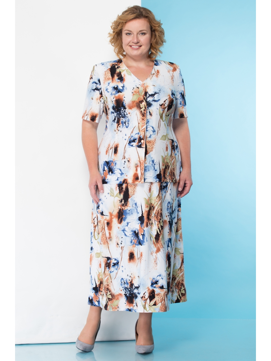 Повседневный трикотажный костюм состоящий из жакета и юбки. Вырез горловины V-образный. Застежка на петли и пуговицы. Юбка на поясе, в поясе по бокам резинки +4 см к ПОТ, застежка на пуговицу и молнию. Длина жакета 61,5 см. ПОГ: 56р-58 см, 58р-60 см, 60р-62 см, 62р-64 см, 64р-66 см, 66р-68 см. Длина юбки -- 89 см. ПОТ (с нерастянутой резинкой): 56р-42 см, 58р-44 см, 60р-46 см, 62р-48 см, 64р-50 см, 66р-52 см. ПОБ:56р-61 см, 58р-63 см, 60р-65 см, 62р-67 см, 64р-69 см, 66р-71 см