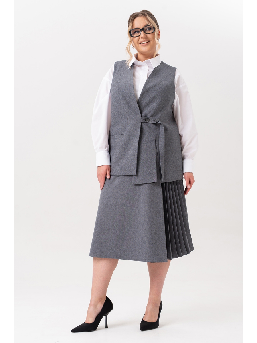 Костюм с юбкой миди – это изысканный выбор для особых моментов вашей жизни. Этот элегантный наряд создан для тех, кто ценит стиль и комфорт. Костюм выполнен из высококачественного "дышащего" материала, поливискозы, что обеспечивает её долговечность. Фактура материала придает костюму особенный шарм. Классический жилет с V-образным вырезом горловины превосходно садится по фигуре, на правой полочке обработан прорезной карман с листочкой, на левой - разрез, застежка обработана на отлетном хлястике, на петлю и пуговицу. Этот элемент делает его более интересным. Жилет на подкладке. Плиссированная деталь юбки добавляет легкости и изящества, делая ваш образ особенно привлекательным. На юбке в боковом шве обработан карман. Удобная посадка пояса юбки, частично на резинке с потайной молнией по среднему шву спинки - это комфорт и свобода движений на весь день. Костюм легко сочетается с любыми аксессуарами, позволяя вам экспериментировать с вашим стилем.
