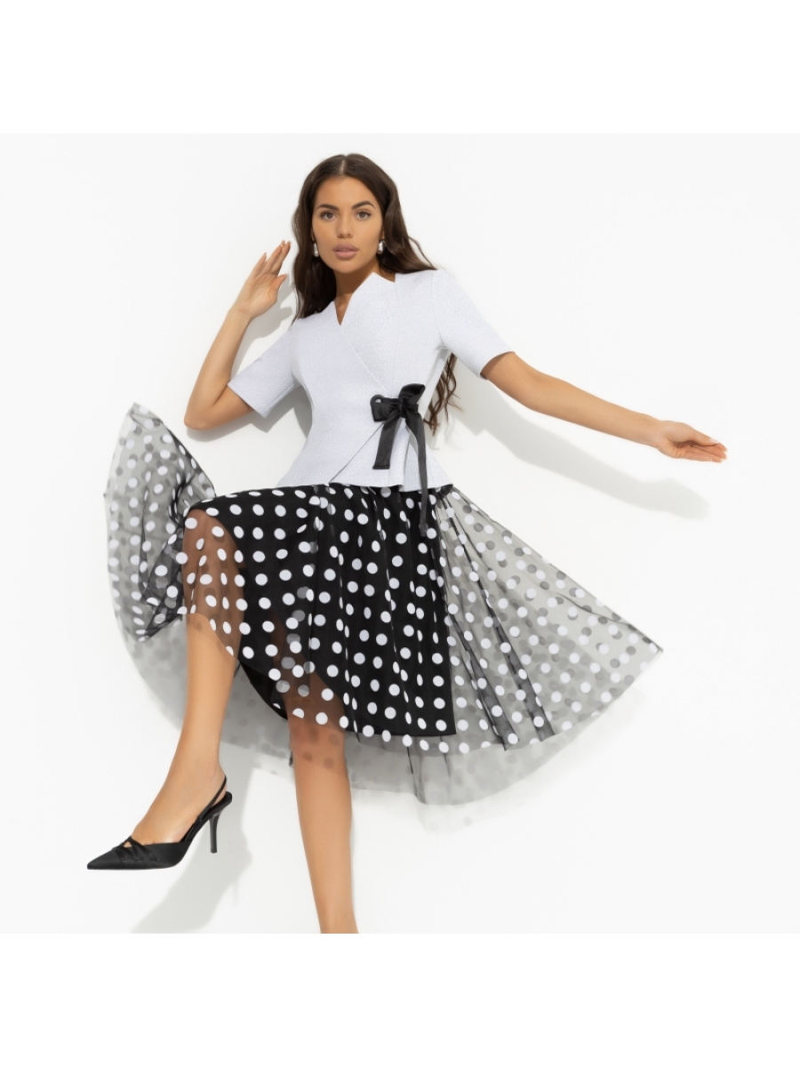 В невесомых воспоминаниях из твоего детства ты идешь с мамой по улице, и все оборачиваются вам вслед. Мама в юбке в крупный горох и узком жакете. Ты понимаешь, что она невероятна прекрасна. Костюм – возвращение в счастливое время. Комплект состоит из приталенного жакета и юбки в длине миди. Ассиметричный дизайн жакета. Застёжка на ленты. Пояс юбки на широкой резинке. Юбка в несколько слоев ткани.