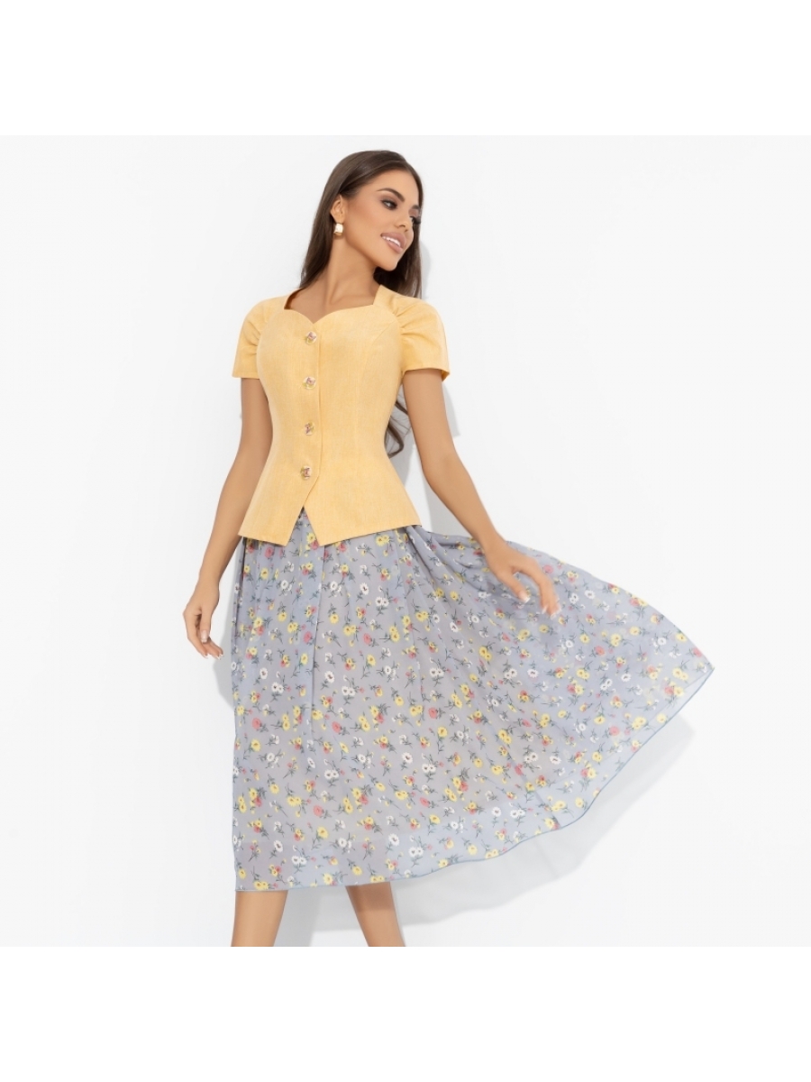 Если бы ты была временем года, то точно весной в костюме ЧАРУТТИ. Легкий, долгожданный, притягательный образ. Осталось только включить пение птиц, как музыкальное сопровождение. Комплект состоит из жакета приталенного силуэта с коротким рукавом и юбки в длине миди. Жакет притален, застегивается на аккуратные пуговицы. Очень красиво смотрится фигурный вырез. На спинке талию украшают деликатные завязки. Пояс юбки на широкой резинке. Юбка с подкладом.