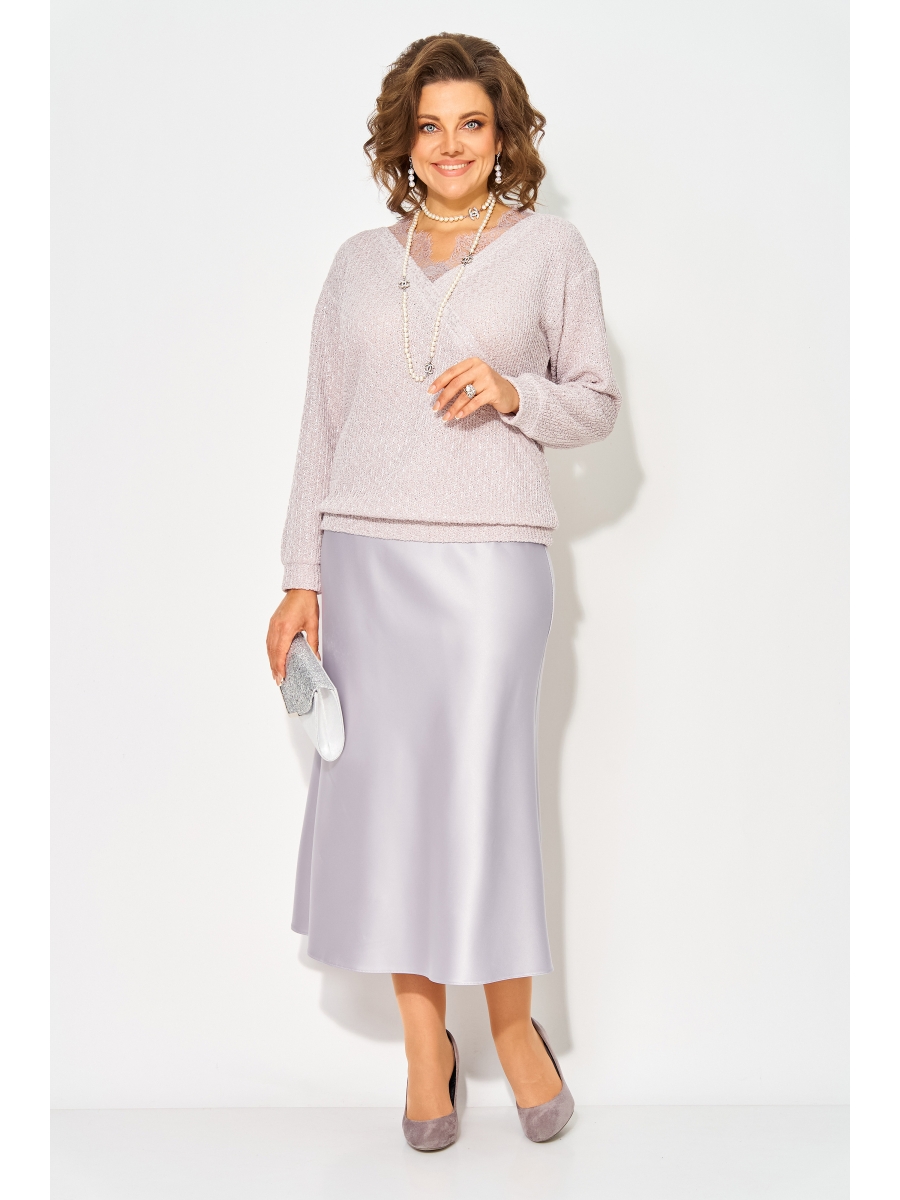 Эффектный праздничный комплект, состоящий из вязанного джемпера с ажуром и сатиновой юбки в жемчужно-лиловой расцветке.