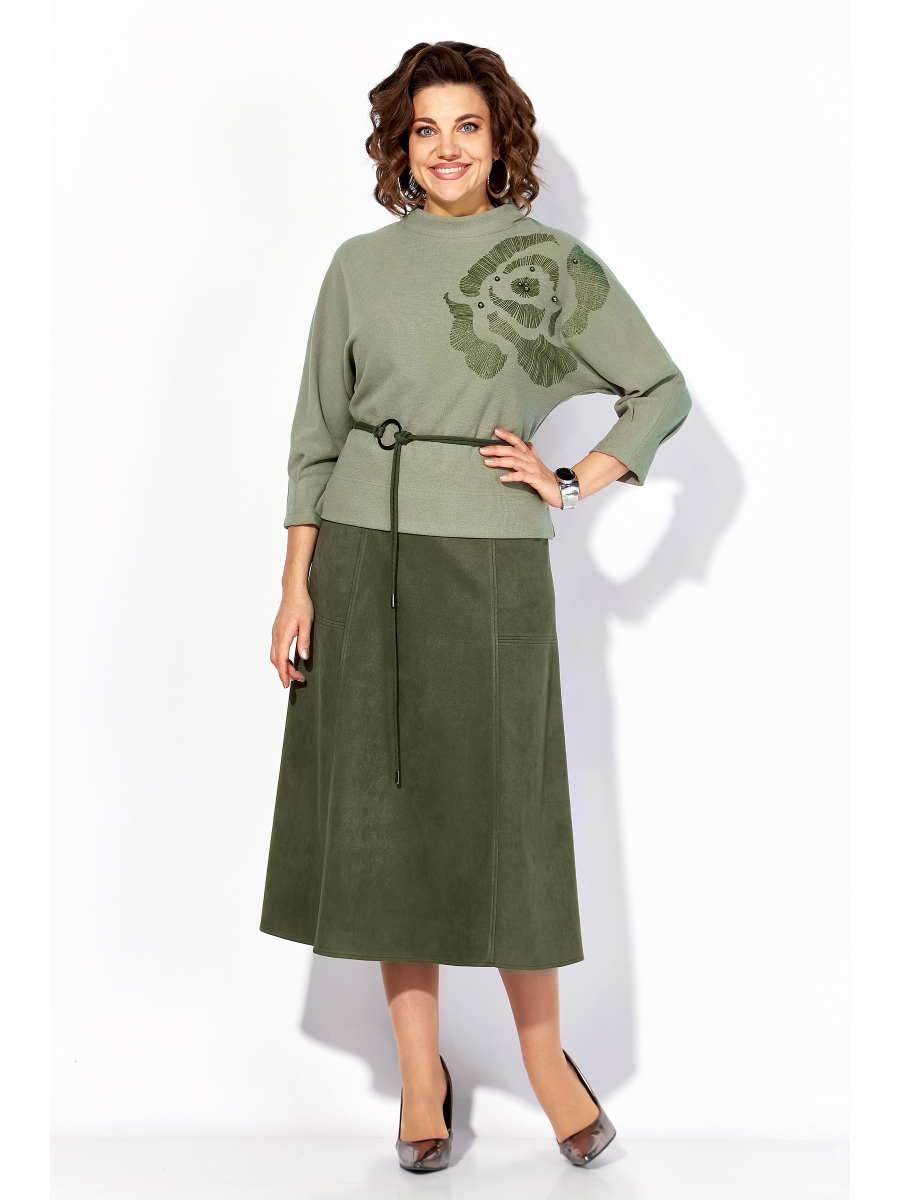 Юбка в комплекте выполнена из искусственной замши – спандекса, на подкладке. Перед с продольными рельефами на расклешение и боковыми карманами. Пояс в юбке притачной, в боковых участках вставлена резинка для комфортного прилегания. Застежка – юбочная тесьма-молния в среднем шве.