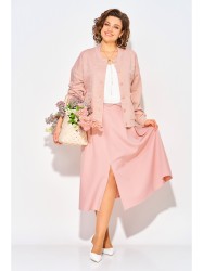В комплект входит юбка длиной миди А-силуэта на притачном поясе с резинкой. По переду заложены складки, имеются боковые карманы. Пикантность образу придает разрез по центру юбки. Застежка – юбочная тесьма-молния по центральному шву спинки.