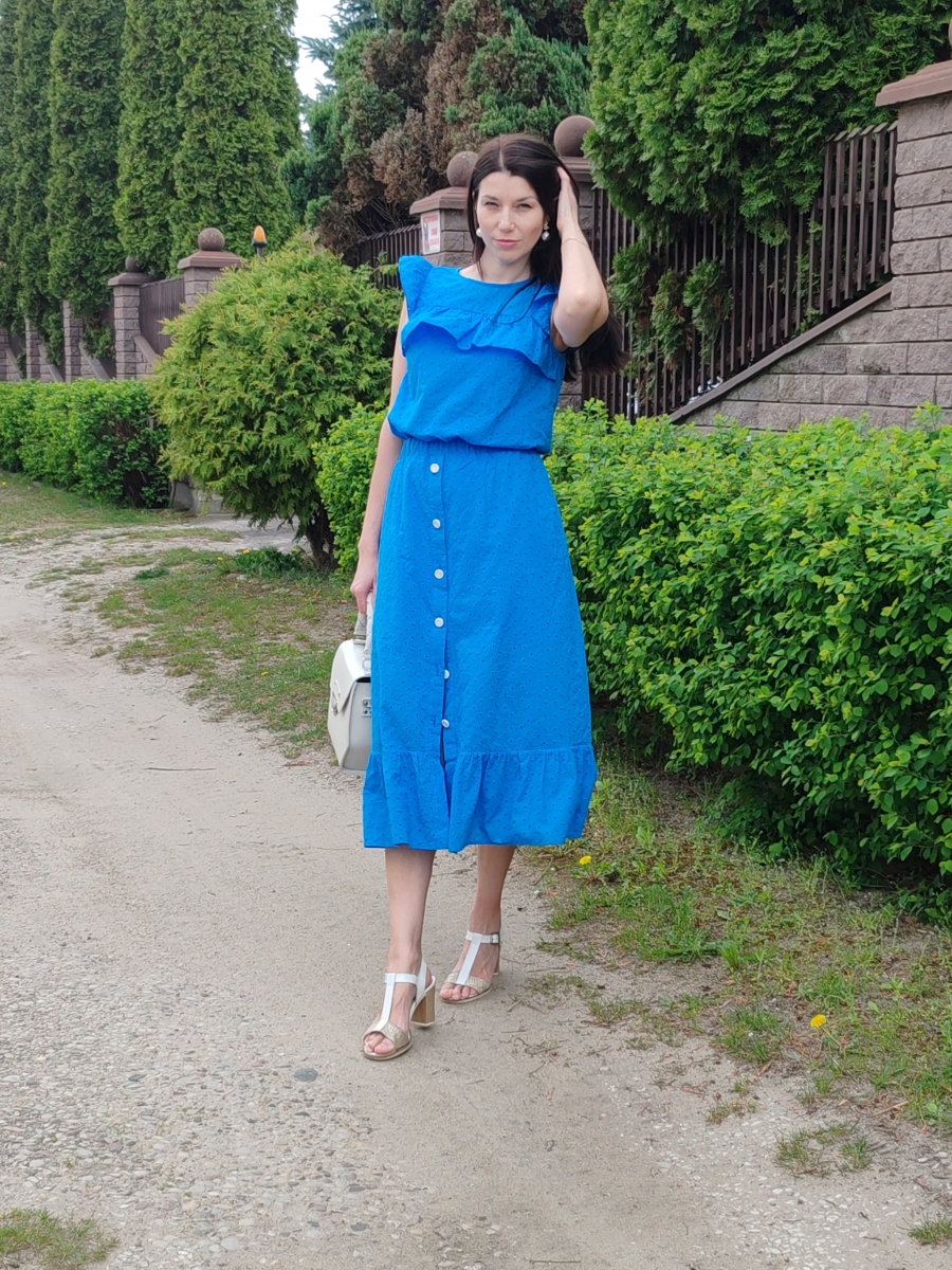 Комплект из хлопковой ткани «ришелье». Блуза прямого силуэта. Горловина круглой формы. Воланы по переду и проймам. Длина блузы по центру спинки - 55 см. Юбка слегка расширена книзу. Верх юбки на поясе с резинкой. Перед с застежкой на петли-пуговицы. В боковых швах расположены карманы. По низу юбки волан. Длина юбки с поясом – 88 см. Рост модели на фото 170 см