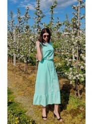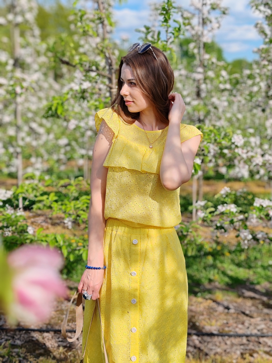 Комплект из хлопковой ткани «ришелье». Блуза прямого силуэта. Горловина круглой формы. Воланы по переду и проймам. Длина блузы по центру спинки - 55 см. Юбка слегка расширена книзу. Верх юбки на поясе с резинкой. Перед с застежкой на петли-пуговицы. В боковых швах расположены карманы. По низу юбки волан. Длина юбки с поясом – 88 см. Рост модели на фото 170 см