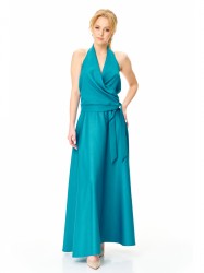 Топ закрывает перед (с переходом на шею), спинку, но оставляет открытыми плечи. Передняя часть топа с мягкой драпировкой на «запах». Притачной пояс завязывается справа. Верх спинки с эластичной тесьмой.
