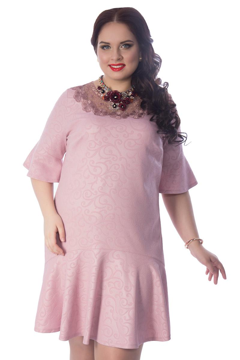 Очаровательное платье полуприлегающего силуэта из трикотажного полотна розового цвета, имитирующего мокрую кожу. Фигурный вырез изделия дополнен кокеткой. Низ втычных рукавов и низ изделия по переду дополнены воланами.