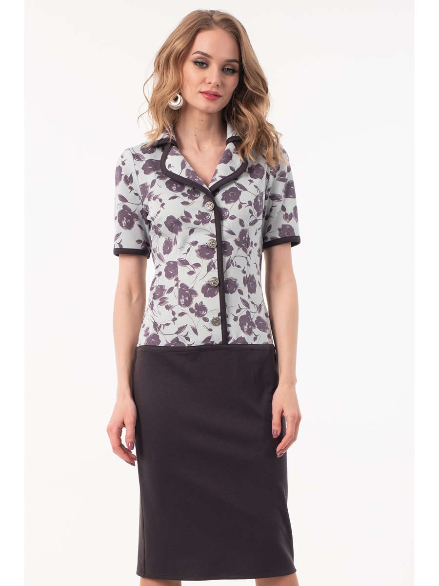Очаровательное платье полуприлегающего силуэта из трикотажного полотна серого цвета. Фигурный вырез платья эффектно подчеркнут отложным воротником. По переду изделия выполнена планка с застежкой на пуговицы. Втачные рукава, воротник и планка переда обработаны контрастной окантовкой. Аксессуары в комплект не входят.