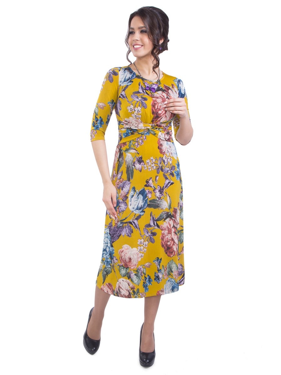 Великолепное платье длины макси полуприлегающего силуэта из трикотажного полотна «масло» горчичного цвета. Круглый вырез горловины изделия обработан внутренней бейкой. Платье с втачными рукавами. Изделие отрезное по линии талии. Линия талии дополнена декоративным втачным поясом с перекрутом.