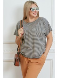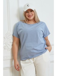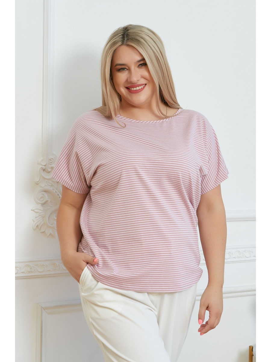 Футболка свободного силуэта, выполнена из эластичного вискозного трикотажа с принтом полоска. Рукав цельнокроеный укороченный. Круглый вырез горловины и вырез "капля" по спинке обработаны окантовкой. Низ изделия ровный. Модель отлично дополнит комплект юбкам и брюкам.