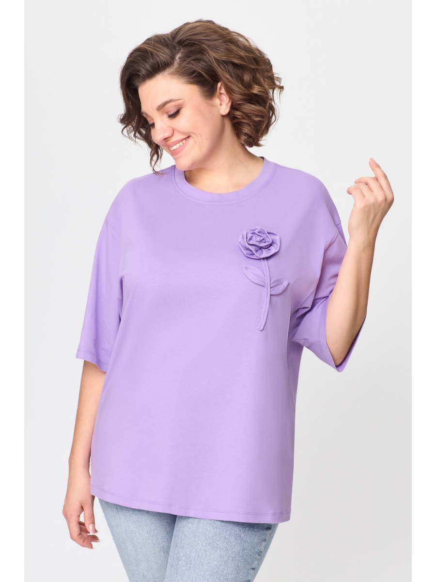 Джемпер прямого силуэта с втачным спущенным рукавом. По левой части переда объемный цветок в тон. Горловина обработана бейкой. Низ футболки и рукавов обработаны на плоскошовной машине. Шов втачивания горловины с отсрочкой.