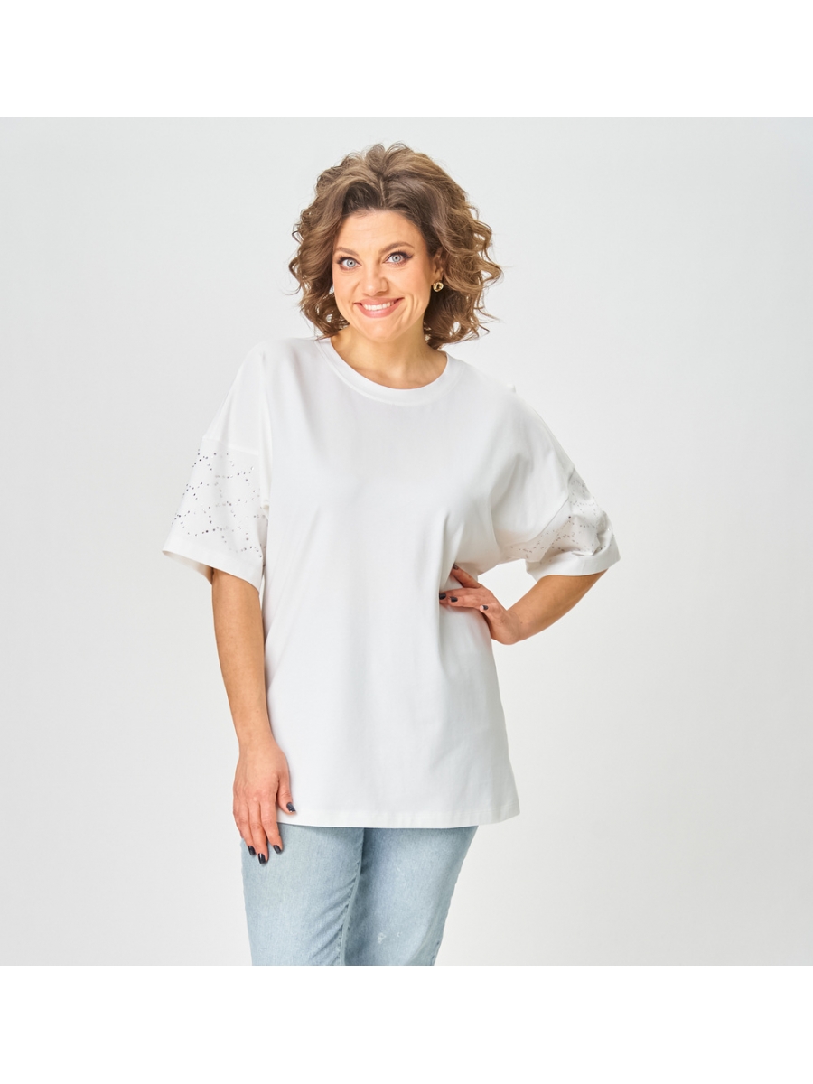 Джемпер женский свободного силуэта ”oversize”, со спущенной линией плеча. Вырез горловины округлый, с притачной планкой. Втачные короткие рукава со стразами добавляет романтичности и изящества.