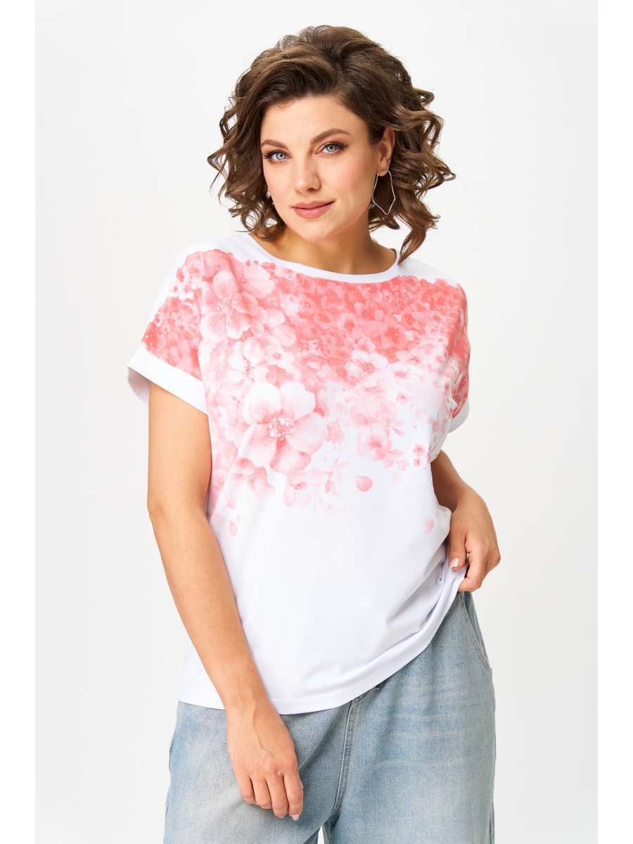 Джемпер из трикотажной хлопковой ткани. Перед футболки с принтом. Спущенное плечо, оформлено притачной манжетой. Вырез горловины круглый, оформлен бейкой. Спинка без среднего шва.