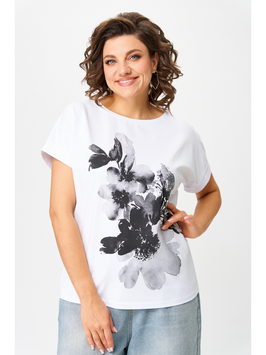 Джемпер из трикотажной хлопковой ткани. Перед футболки с принтом. Спущенное плечо, оформлено притачной манжетой. Вырез горловины круглый, оформлен бейкой. Спинка без среднего шва.