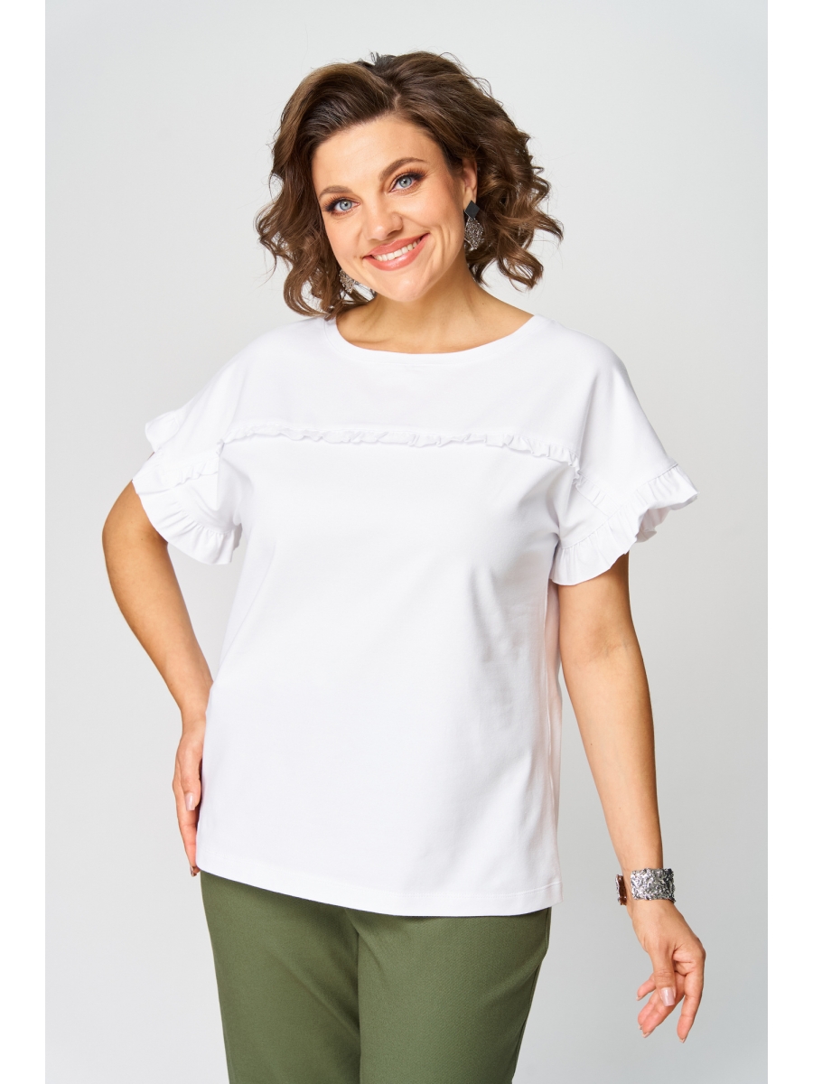 Джемпер женский прямого силуэта. Перед джемпера оформлен притачной кокеткой по полочке и спинке. В шов притачивания вставлена рюша. Спущенное плечо. Вырез горловины ""круглый"", оформлен бейкой.