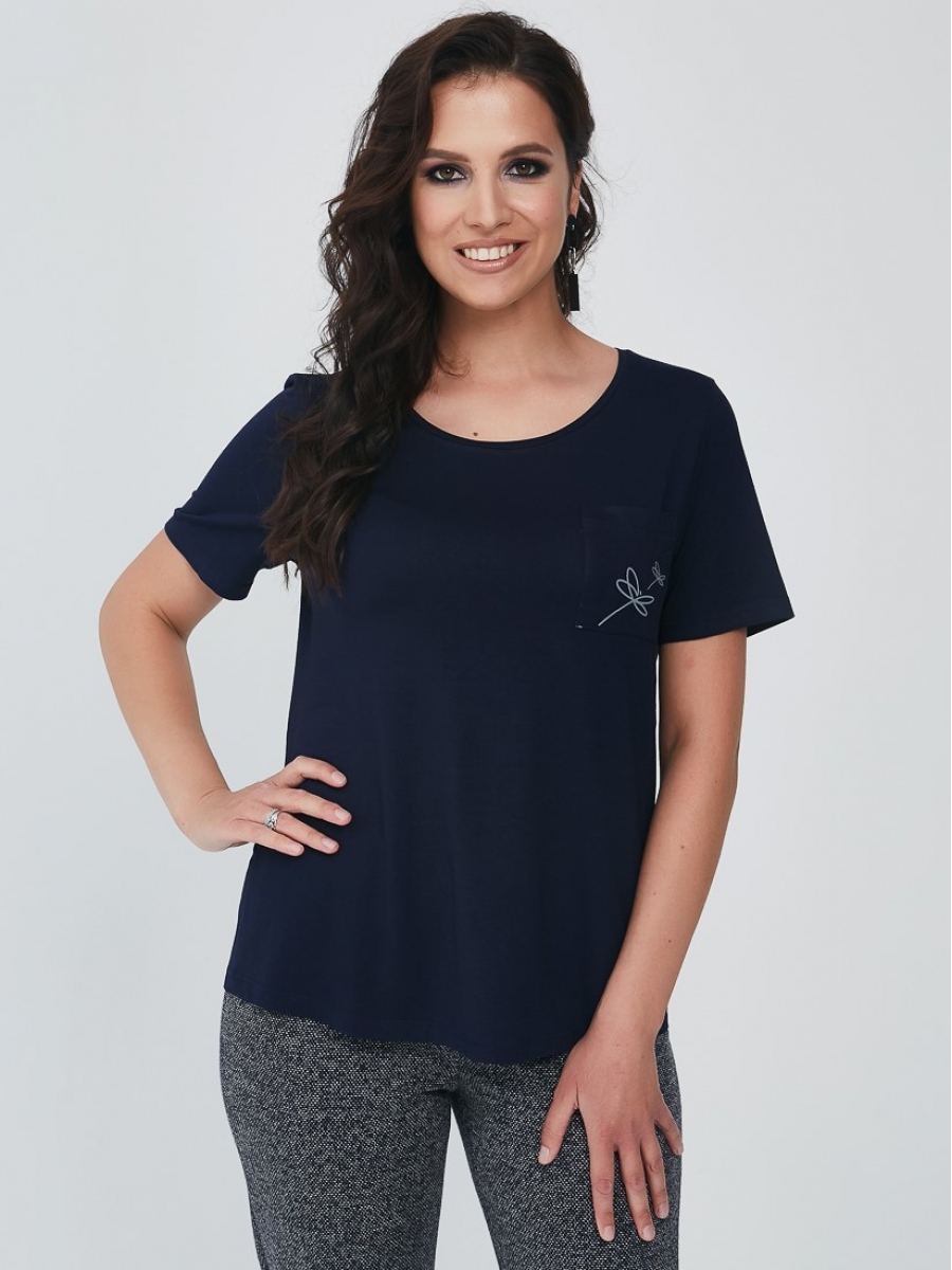 Блуза женская из тонкого трикотажного полотна с добавлением эластана, прямого силуэта. Горловина круглая, с притачной бейкой. Рукав втачной, короткий. Перед с нагрудным карманом. На кармане выполнена печать.