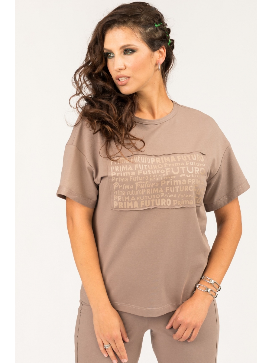 Блуза женская прямого силуэта. Горловина круглая, рукав втачной, короткий. Посередине переда настрочена деталь с печатью. Горловина переда и спинки окантована бейкой из основного сырья.