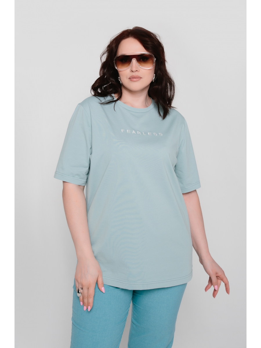 Блуза женская прямого силуэта. Горловина круглая, с притачной бейкой. Рукав втачной, короткий. По переду выполнена вышивка. Изделие изготовлено из кулирной глади.