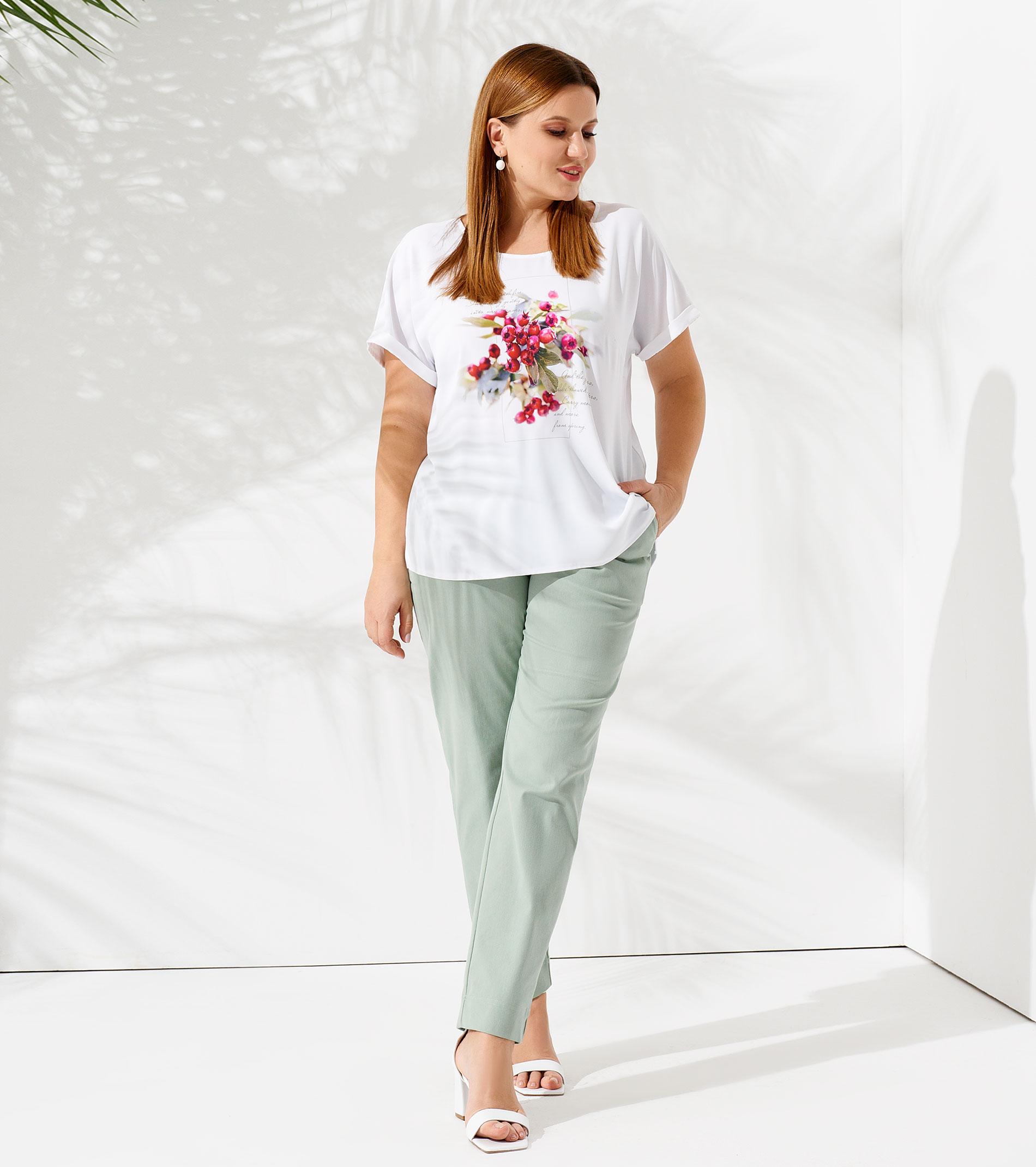 Женская блузка с принтом легко станет акцентной деталью созданного вами летнего образа. Она превосходно комбинируется в самых смелых сетах с брюками, джинсами, юбками, шортами. Модель пошита из приятного на ощупь хлопкового трикотажа, максимально пропускающего воздух к телу и обеспечивающего комфортные ощущения. Летняя блузка-футболка женская прямого кроя спереди украшена по центру ярким флористическим рисунком с надписью. Удлиненное изделие с коротким рукавом дополнено нешироким отворотом. Вырез горловины – крупный, круглый. Предлагаем вам купить красивые женскую футболку больших размеров по приемлемой стоимости.