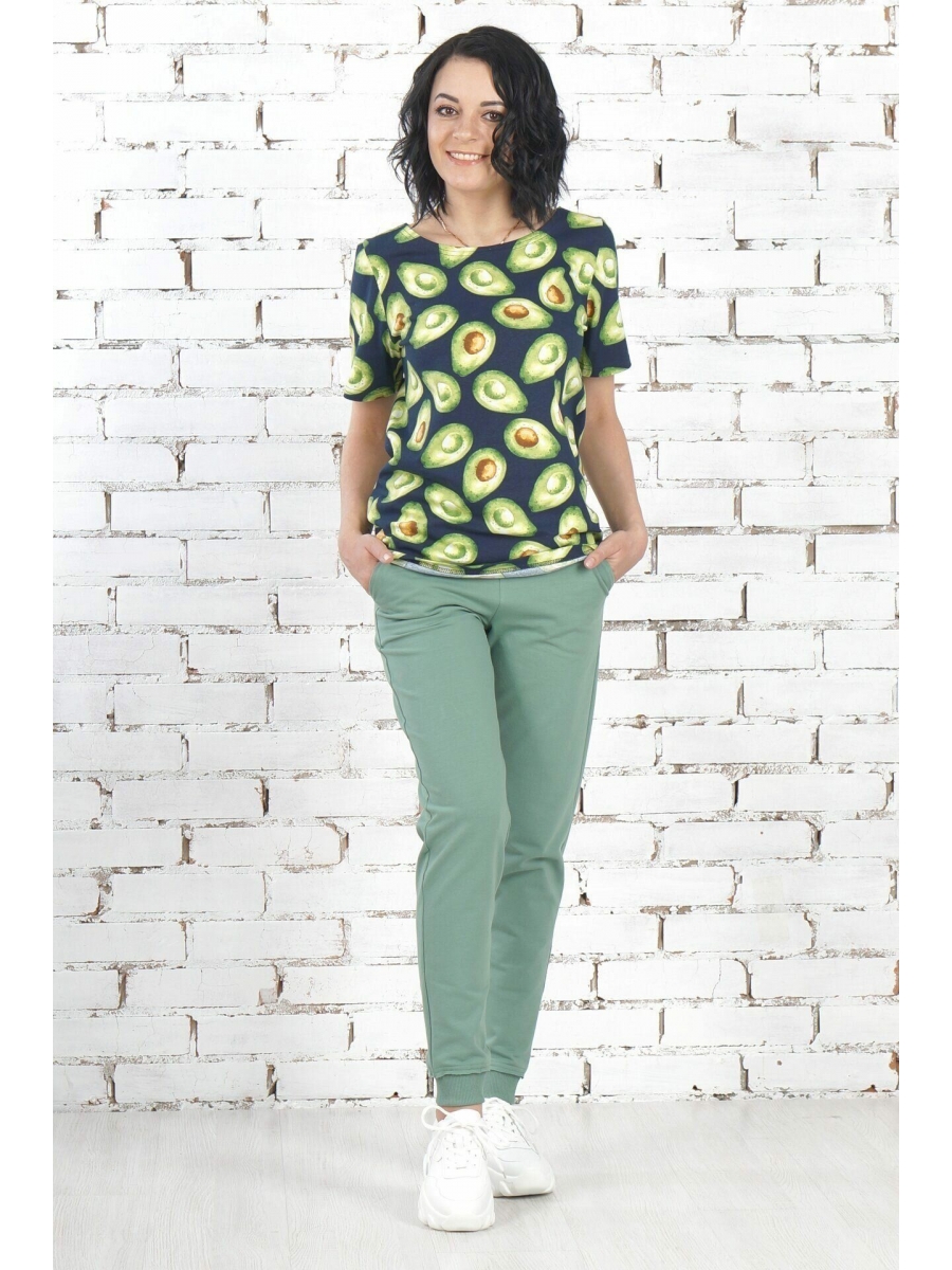 Блуза из трикотажного полотна с добавлением эластана. Расцветка авокадо на тёмно-синем. Круглый вырез горловины. Низ прямой, без подклада без застёжки.