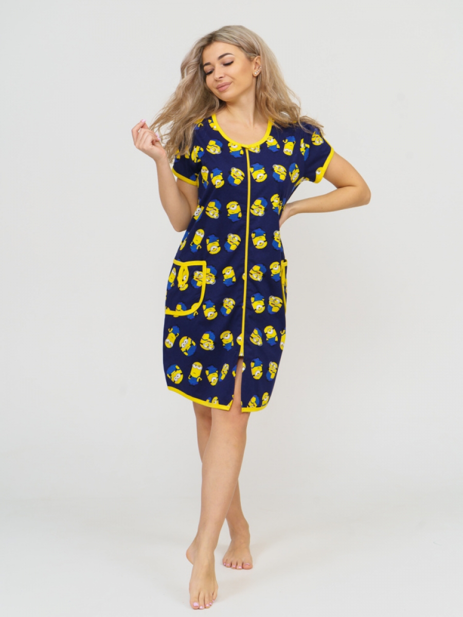 Яркий, женственный халат из легкого, приятного на ощупь натурального хлопка. Модель полуприлегающего силуэта с застежкой на тесьму-молнию. Перед с 2 накладными карманами. Короткий рукав, округлый вырез горловины делают изделие не только удобным, но и очень стильным!