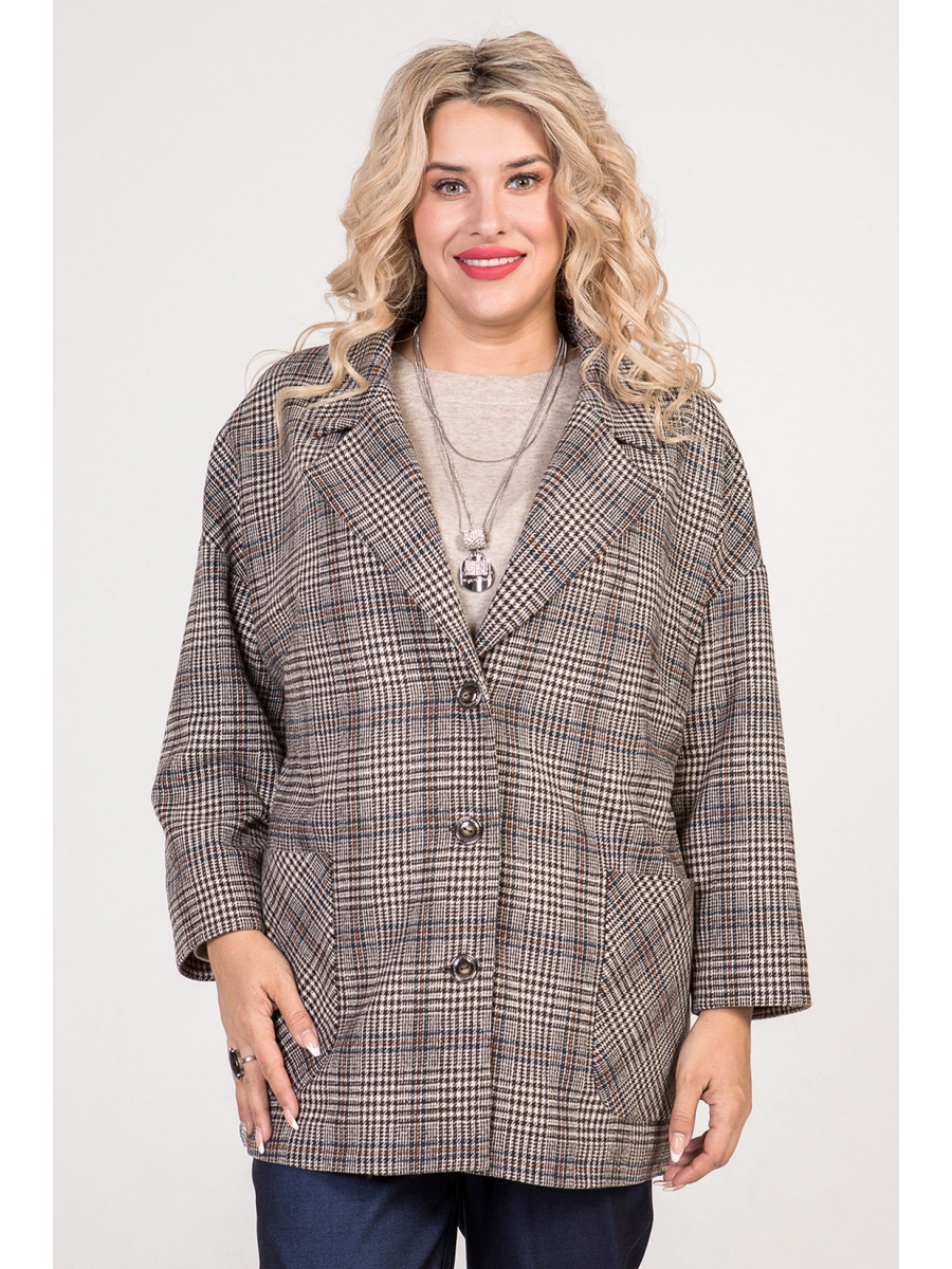 Жакет из теплой костюмной ткани на подкладке, длиной за линию бедер. Втачной длинный рукав и спущенная линия плеча. V-образный вырез горловины дополнен отложным воротником. Застежка центральная - на петли и пуговицы. Модель с накладными удобными карманами, скроенными по косой. Низ ровный. Жакет станет отличным дополнением как делового, так и повседневного гардероба.