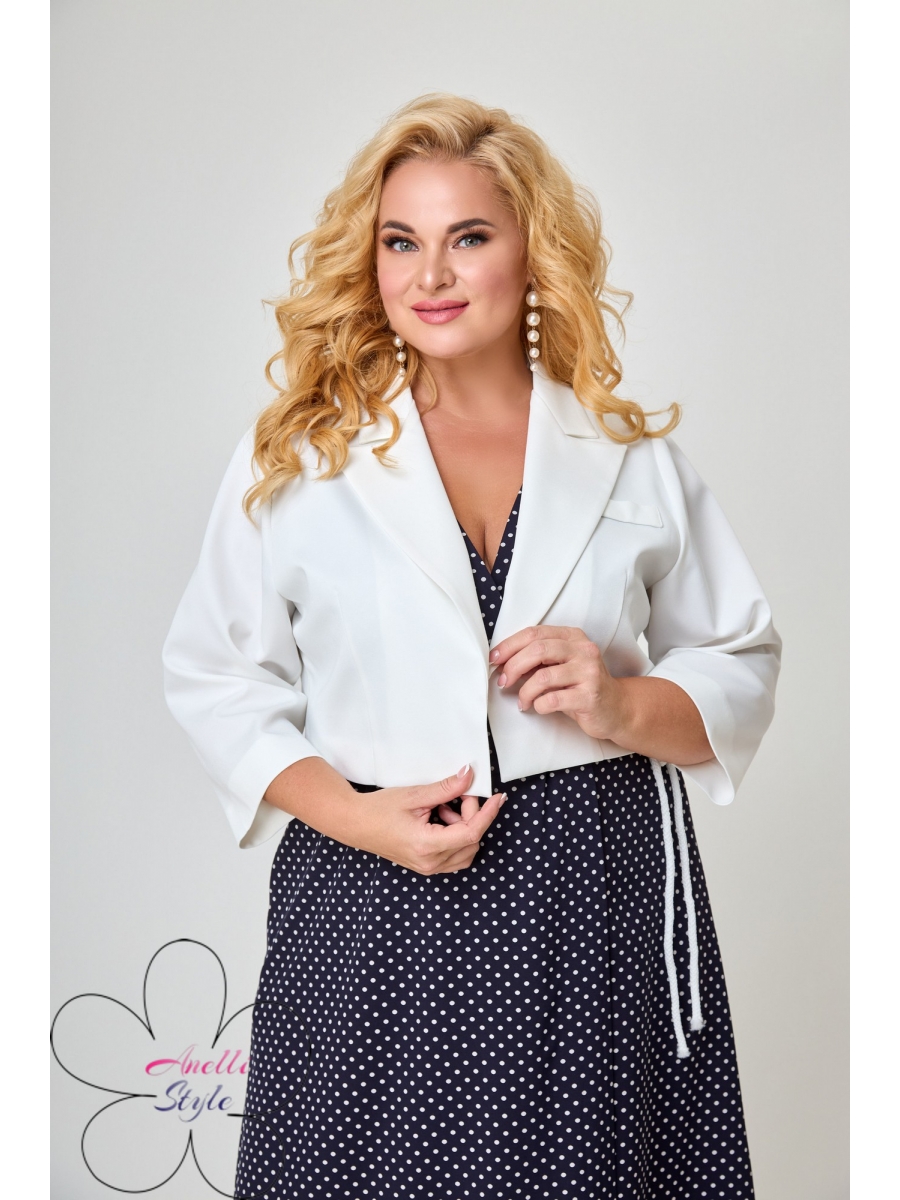 Жакет-болеро укороченный, на подкладке, длиной до линии талии. Рукав 3/4, втачной. Горловина обработана воротником с лацканом. По переду слева декоративная листочка.