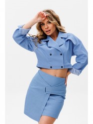 Укороченный жакет свободного силуэта, двухбортный со спущенным плечом. Перед и спинка на кокетках. По переду в кокетках декоративные клапаны. Рукав длинный на притачной манжете.
