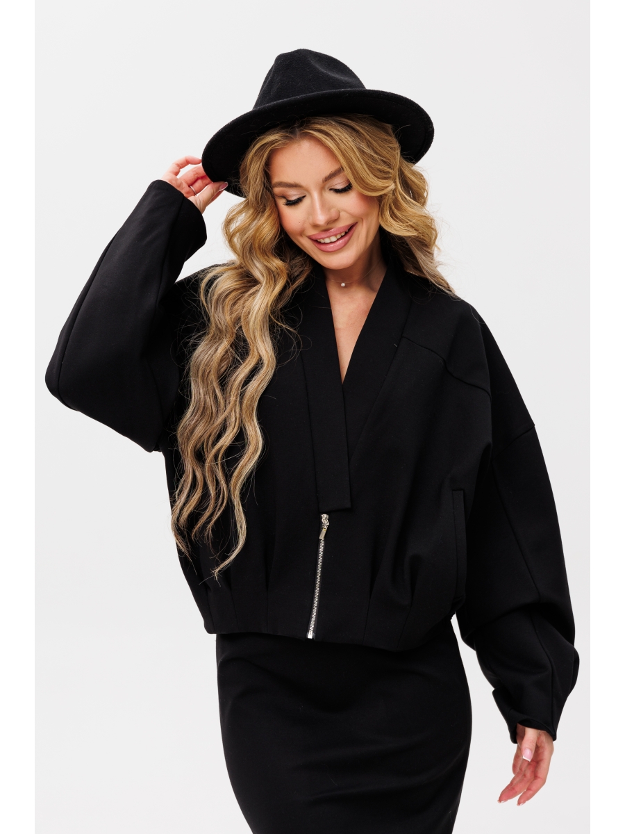 Жакет-бомбер "ОВЕРСАЙЗ" со спущенным плечом, воздушным рукавом, по низу рукава бантовые складки. По переду завтежка на молнию, воротник "шаль". Перед жакета на кокетке, по низу заложены складки. Спинка на кокетке, по низу резинка.