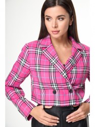 Кроп-жакет-это укорочённый классический двубортный жакет из костюмной ткани. Один из главных трендов. Прямой силуэт, втачной двухшовный рукав со шлицей. Отложной воротник с лацканами. В среднем шве спинки шлица.
