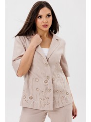 Воротник пиджачного типа, застежка центральная на три петли и пуговицы. Снизу полочки декоративная дизайнерская вышивка. Спинка со средним швом, который заканчивается шлицей. Рукав одношовный втачной, длиной по локоть.