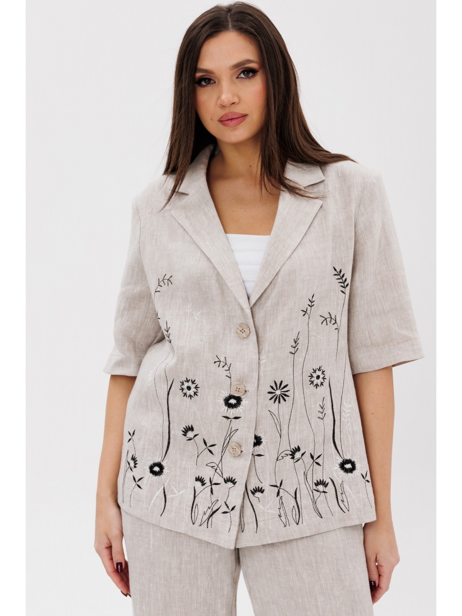 Воротник пиджачного типа, застежка центральная на три петли и пуговицы. Снизу полочки декоративная дизайнерская вышивка. Спинка со средним швом, который заканчивается шлицей. Рукав одношовный втачной, длиной по локоть.
