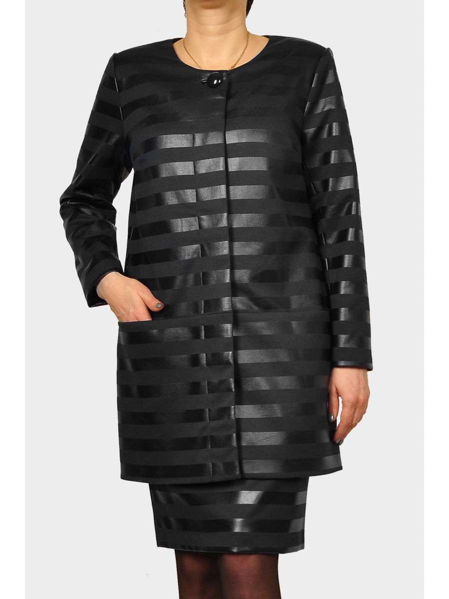 Оформить заказ →Удлиненный женский жакет из трикотажного полотна с нанесением кожаной полоски шириной 2 см. С карманами, по груди вытачки, застежка пуговица и потайная планка с пуговицами. Жакет на подкладке. По спинке центральный шов.