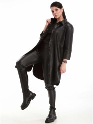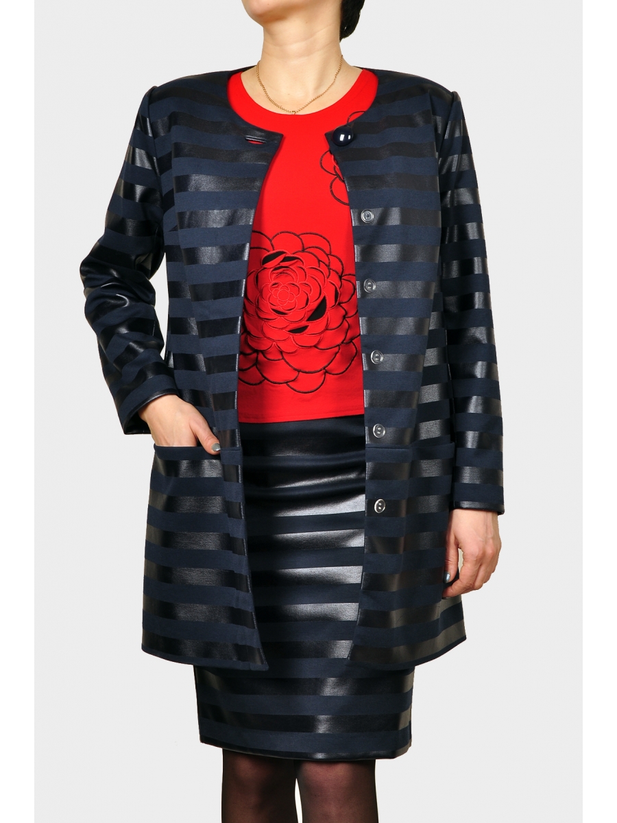 Удлиненный женский жакет из трикотажного полотна с нанесением кожаной полоски шириной 2 см. С карманами, по груди вытачки, застежка пуговица и потайная планка с пуговицами. Жакет на подкладке. По спинке центральный шов.