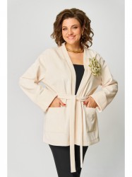 Жакет женский свободного прямого силуэта, длиной ниже линии бедер. Жакет без подкладки со съемным поясом и накладными карманами. По переду и горловине спинки притачная планка, без застежки. Линия плеча слегка спущена. Рукав втачной длинный с отложной манжетой. В боковых швах разрезы.