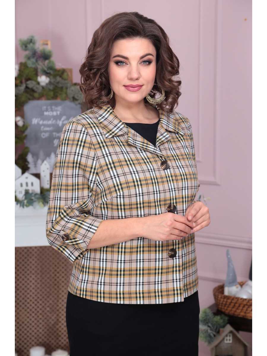 Изящный и актуальный укорочённый жакет из костюмно-плательной ткани в тренде: клетка в тёплых тонах просто хит будущего сезона! В составе ткани содержится эластан, что позволяет чувствовать себя уютно и комфортно . Силуэт жакета чуть прилегающий, более прямой, не сковывает движения за счёт умеренной свободы. Изделие с плечевыми накладками и без подкладки. По переду центральная застежка на петли-пуговицы, линия борта прямая, по лифу нагрудные вытачки. Округлая горловина с притачным отложным воротником, спинка цельная с талиевыми вытачками. Рукав в меру свободный, втачной одношовный, длиной 3/4. В низу рукава в качестве декора расположена пата с пуговицей. Лёгкий, яркий и такой стильный жакет украсит и дополнит любой образ, созданный Вами, просто незаменимая вещь в гардеробе.