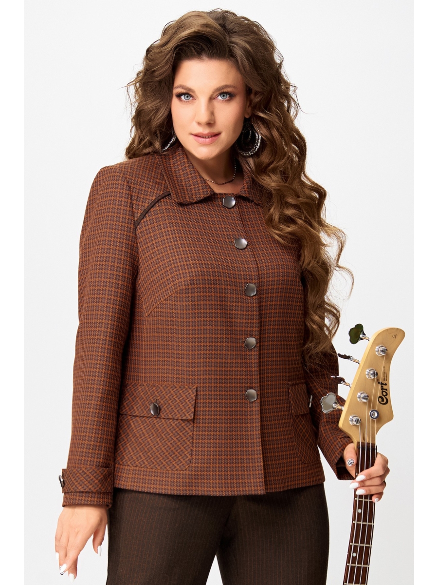 Женский стильный жакет ""Венциана"" из клетчатого текстиля, полностью на подкладке, с элегантным полуприлегающим силуэтом. Его дизайн отличает однобортная застежка на пуговицы и классический отложной воротник. Передняя часть изделия искусно оформлена нагрудными вытачками и отрезными бочками, а верхняя часть полочки украшена кокеткой с вшитым декоративным кантом.
