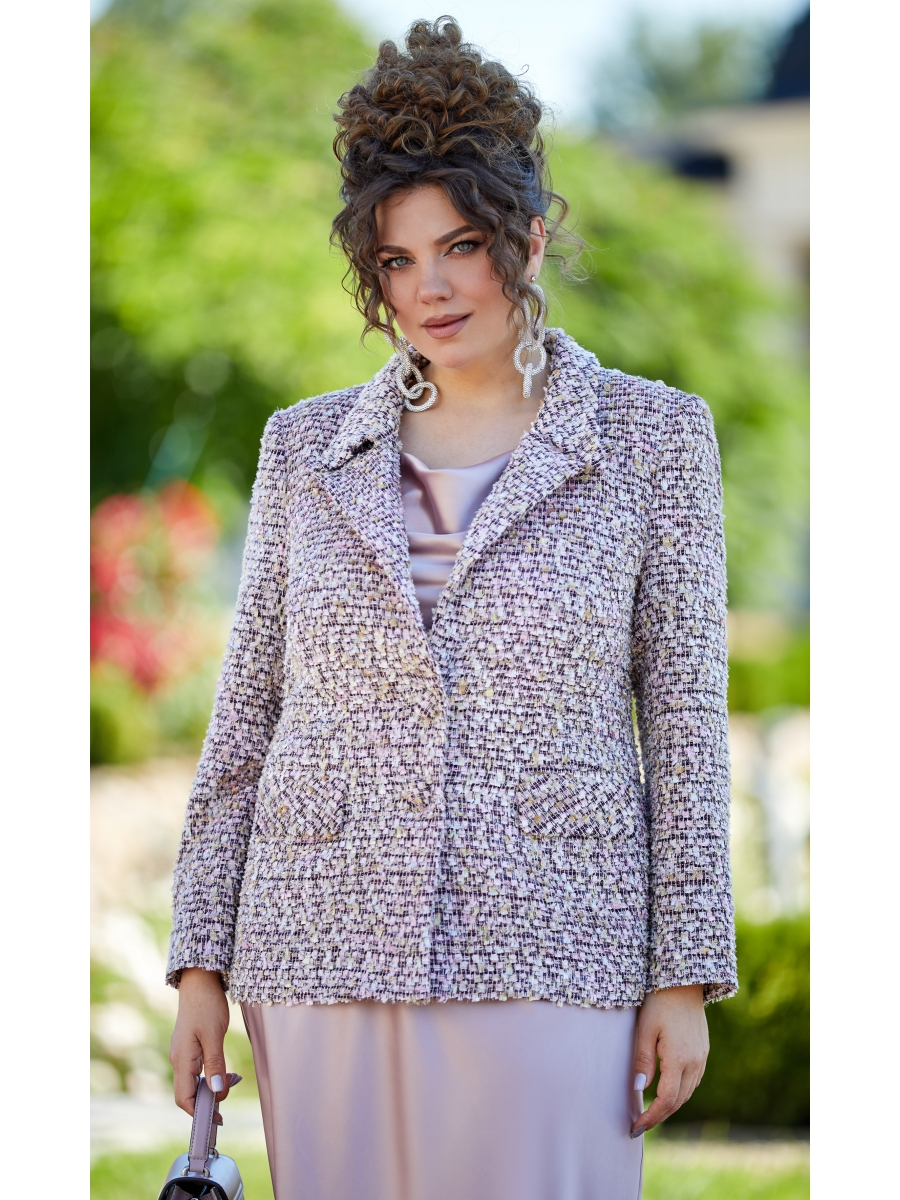 Жакет полуприлегающего силуэта на подкладке, удлинённый с центральной застёжкой на отделочные пуговицы по борту и с отложными лацканами. По переду жакета рельефы и прорезные карманы с клапанами. Спинка в жакете со средним швом и рельефами. Рукав втачной, двухшовный, длинный.
