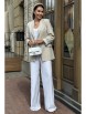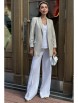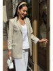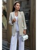 Жакет женский полуприлегающего силуэта из костюмной ткани, с центральной бортовой застежкой встык без петель и пуговиц (в носке эксплуатируется нараспашку) и с отложными лацканами. Жакет на притачной подкладке. Перед жакета с боковыми рельефными швами идущими от проймы до низа изделия и нагрудными вытачками расположенными под лацканами. Перед с прорезными карманами «в рамку» и клапанам, расположенными чуть ниже линии талии. Углы клапана - прямые. Спинка с боковыми рельефными швами от линии проймы до линии низа и со средним швом. Рукава втачные двухшовные, длинные. Низ рукава с заворотом на манжету из отделочной ткани становится длиной 7/8. Плечевой пояс оформлен при помощи плечевых накладок. Воротник пиджачного типа. Углы воротника прямые, лацканы - острые. Края борта с наклонной линией.