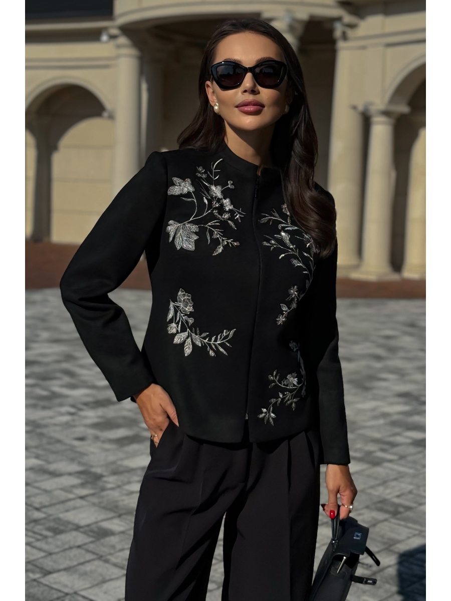 Жакет женский нарядный, полуприлегающего силуэта, выполнен из мягкой искусственной замши на трикотажной основе, с центральной бортовой застежкой ""встык"" с разъемной потайной молнией. Молния расположена на расстоянии 5,0 см от низа и заканчивается у воротника-стойки. Жакет на подкладке. Перед и спинка оформлены художественной вышивкой. Перед со смещенными рельефными швами, идущими из пройм до низа, с нагрудными вытачками от рельефов. Спинка с рельефными швами, идущими из пройм до низа и средним швом. Горловина оформлена воротником-стойкой. Рукава втачные, двухшовные, длинные, по низу локтевых швов с отлетными шлицами.