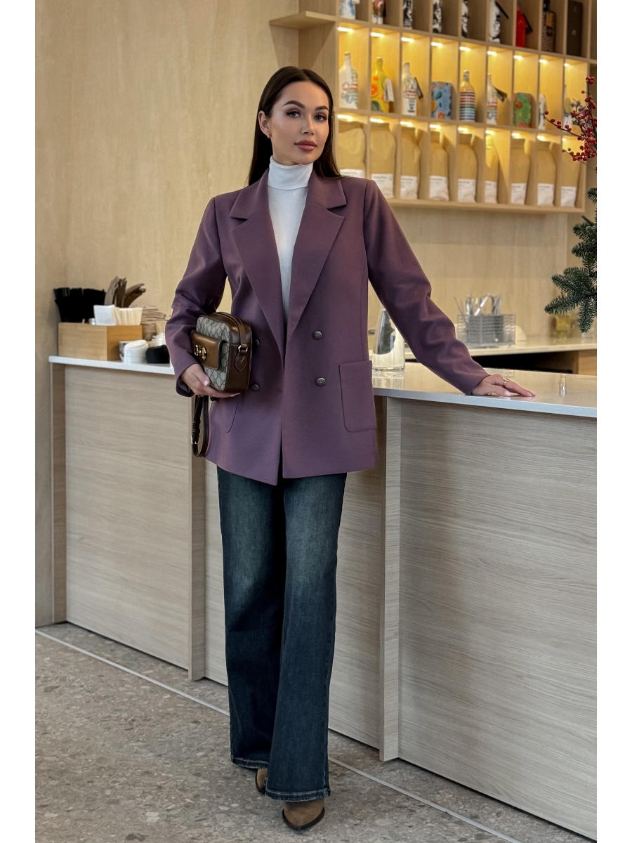 Жакет женский, свободного полуприлегающего силуэта, выполнен из костюмной ткани, на подкладке, с двубортной застежкой на 2 петли и 4 пуговицы (размер и цвет фурнитуры может незначительно отличаться от фото). Жакет предназначен для повседневной носки. Перед и спинка с отрезным бочком. Перед с нагрудными вытачками идущими от рельефов к центрам, в нижней части с накладными карманами. Карманы со скругленными углами. Спинка со средним швом. Горловина оформлена воротником пиджачного типа. Рукава втачные, двухшовные, длинные. Жакет с плечевыми накладками.