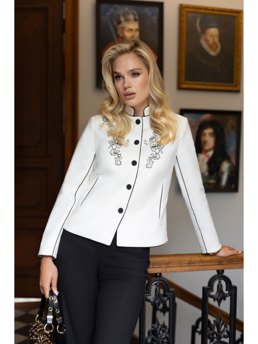 Белый замшевый жакет с вышивкой от URS — это воплощение элегантности и безупречного вкуса. Модель создана для женщин, которые ценят классику, роскошь фактуры и внимание к деталям. Нарядный приталенный жакет выполнен из мягкого замшевого полотна, что придаёт образу благородство и утончённость, сохраняя при этом комфорт и лёгкость движений.