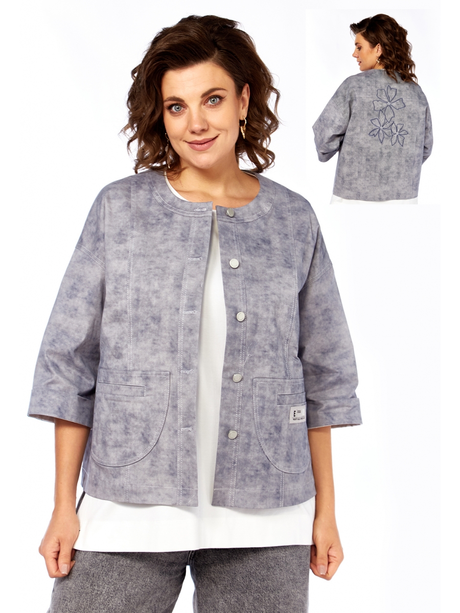 Жакет прямого силуэта, с центральной бортовой застежкой на петли и джинсовые пуговицы. Горловина округлой формы с отрезной обтачкой. По переду обработаны рельефы и накладные детали фигурной формы, в которых выполнены карманы. На спинке обработаны рельефы и кокетка. Рукава спущенные, с широкой подгибкой низа. Изделие дополнено по спинке дизайнерской вышивкой.