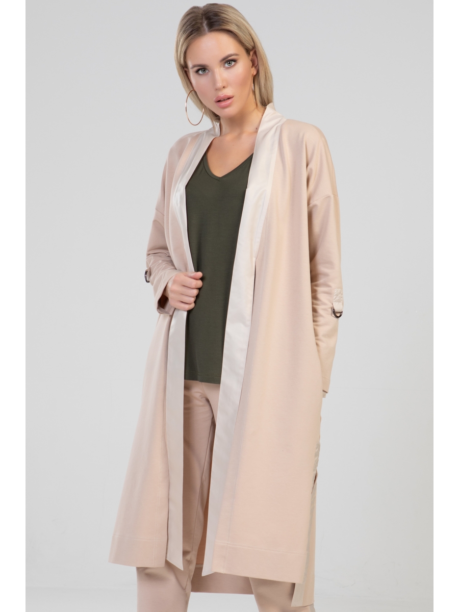 Жакет прямого силуэта, разноуровневый, без застежки, с разрезами и карманами в боковом шве. Воротник отложной с цельнокроеными завязками. Плечо спущенное. Рукав втачной, длинный, с патой, продетой в полукольца для регулировки длины рукава.Воротник, цельнокроеный с завязками, паты рукава, обтачки бокового разреза выполнены из тонкой плащевой ткани в тон основного сырья. Цвет мокко.