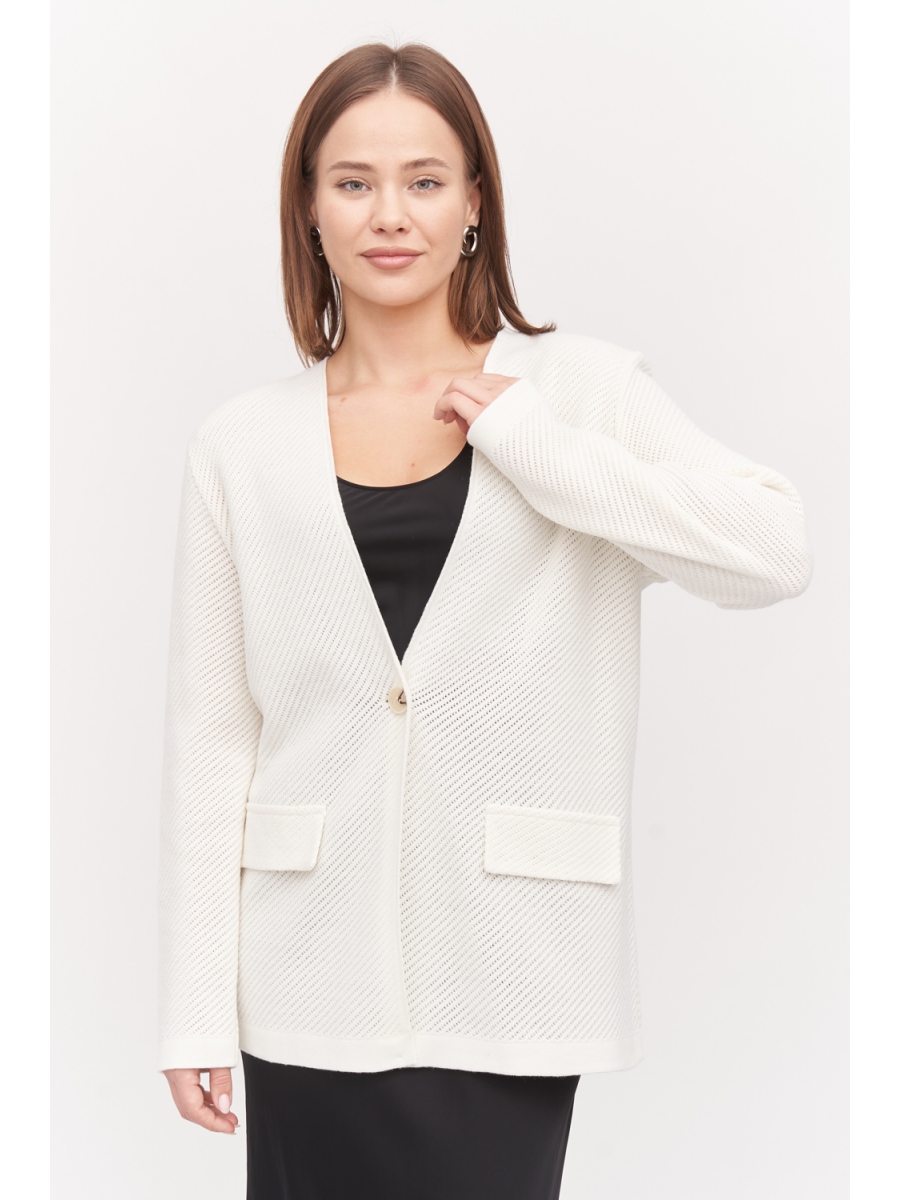 Женский вязаный жакет полуприлегающего силуэта на пуговице с V-образным вырезом. Рукава втачные, длинные. Жакет выполнен из качественной пряжи с составом 30% хлопок 70% ПАН. Модель имеет клапан, имитирующий карманы. Жакет выполнен переплетением, образующим диагональный рубчик. Легкий, эффектный жакет поддержит и деловой образ, и праздничное настроение. Отлично сочетается с любым низом в комплекте. Модель классическая, праздничная и повседневная, абсолютно на любой случай жизни.