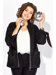Эффектный, нарядный облегченный жакет, выполнен из вязанного трикотажа с эффектом легкого мерцания. Модель свободного силуэта, с рукавом длиной ¾-ти на спущенном плечевом поясе. Горловина обработана полулежащей стойкой. Застежка центральная на молнию. По полочке расположены аккуратные накладные карманы. Низ изделия оформлен притачной планкой.