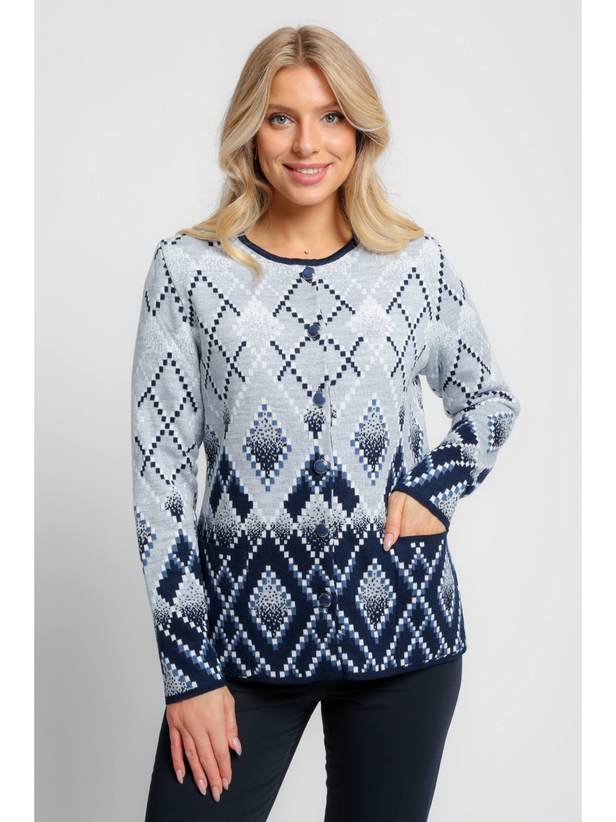 Женский трикотажный жакет полуприлегающего силуэта. Рукава втачные длинные. Жакет застегивается на пуговицы, горловина круглая. Два накладных кармана квадратной формы. Изделие выполнено жаккардовым переплетение образующим геометрический рисунок с цветовым переходом от светлого к темному.