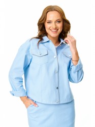 Стильный облегченный укороченный жакет-рубашка из хлопковой комбинированной по цвету ткани свободного силуэта. С воротником, застежка на петли-пуговицы. По переду накладные карманы. По спинке складка от кокетки. Низ свободный, спинка стягивается. Рукав длинный с манжетой.