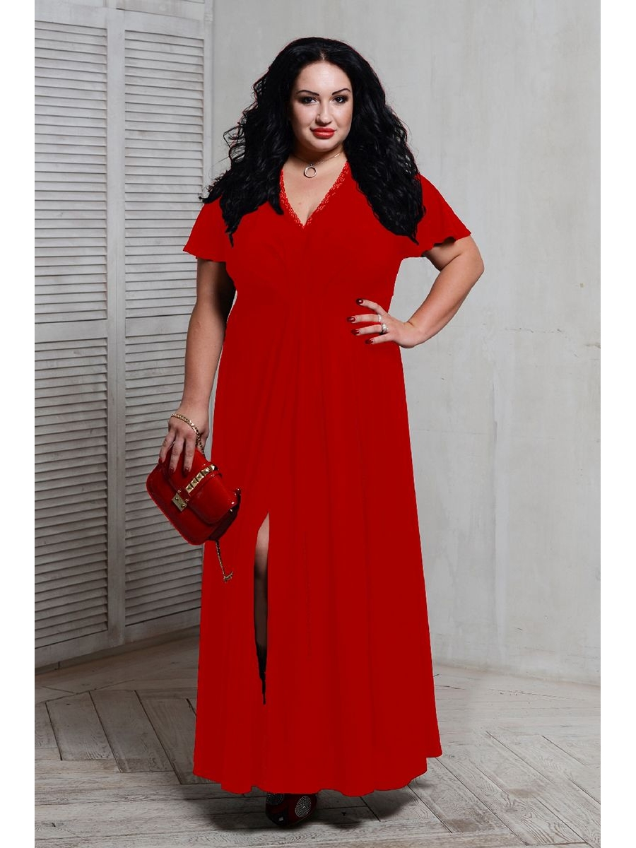 Элегантное длинное вечернее платье из легкого трикотажа красного цвета. V-образный вырез украшен кружевом, спереди широкой юбки разрез.