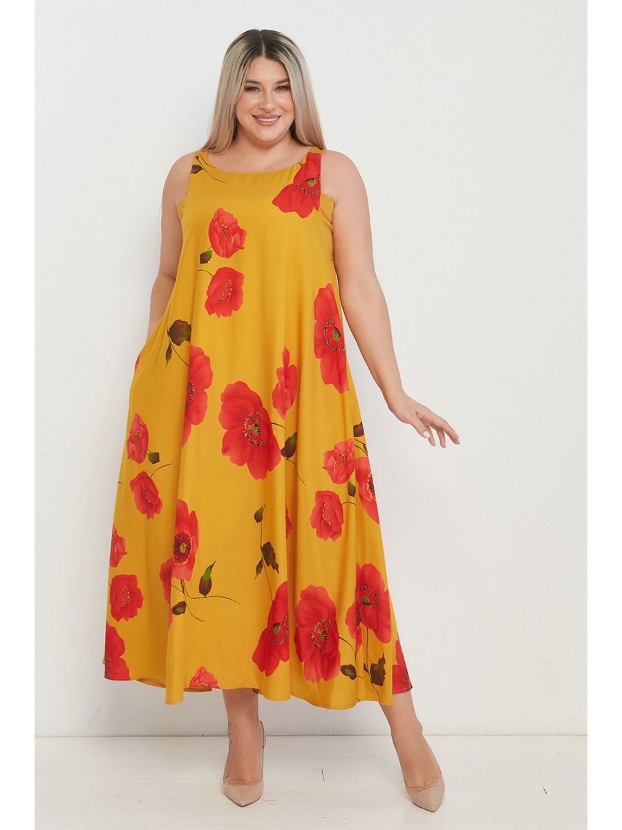 Яркое платье, А - образного силуэта на широких бретелях, длиной чуть выше щиколотки. Модель выполнена из хлопковой ткани с принтом «цветы». В области проймы оригинальные однотонные вставки. В боковых швах удобные карманы, низ ровный. Комфортная модель для летнего образа отлично скрывающая все недостатки фигуры